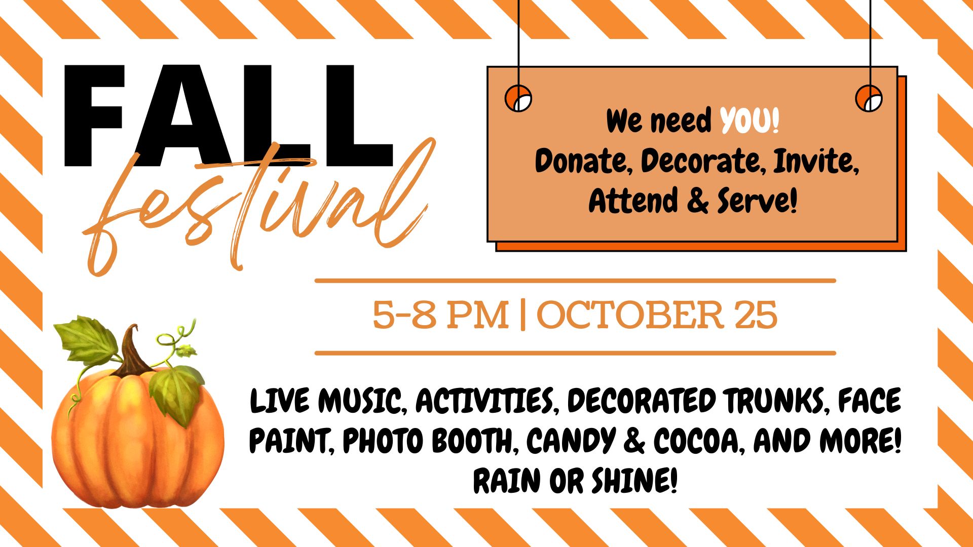 This is a family friendly event on October 25th from 5-8pm at Park Hill Baptist Church. Enjoy tons of activities: live music, games/activities, decorated trunks, face painting, photo booth, and a bonfire. Plus, more candy and fun than your kids can handle. Costumes welcome!